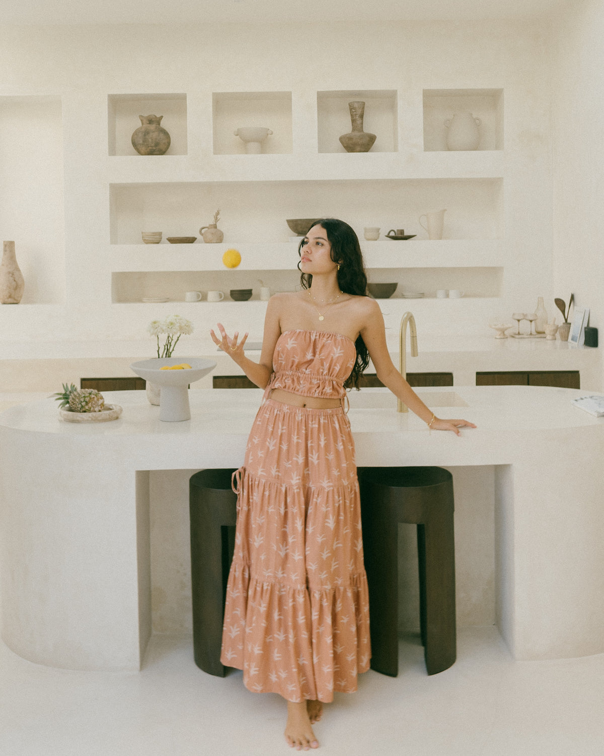 This high-waisted, flowy skirt features a warm rust palm print and subtle ruched detailing for a flattering silhouette. Pair it with the matching Aliya Crop and nude sandals for a complete, breezy look that’s perfect from beachside strolls to evening drinks.