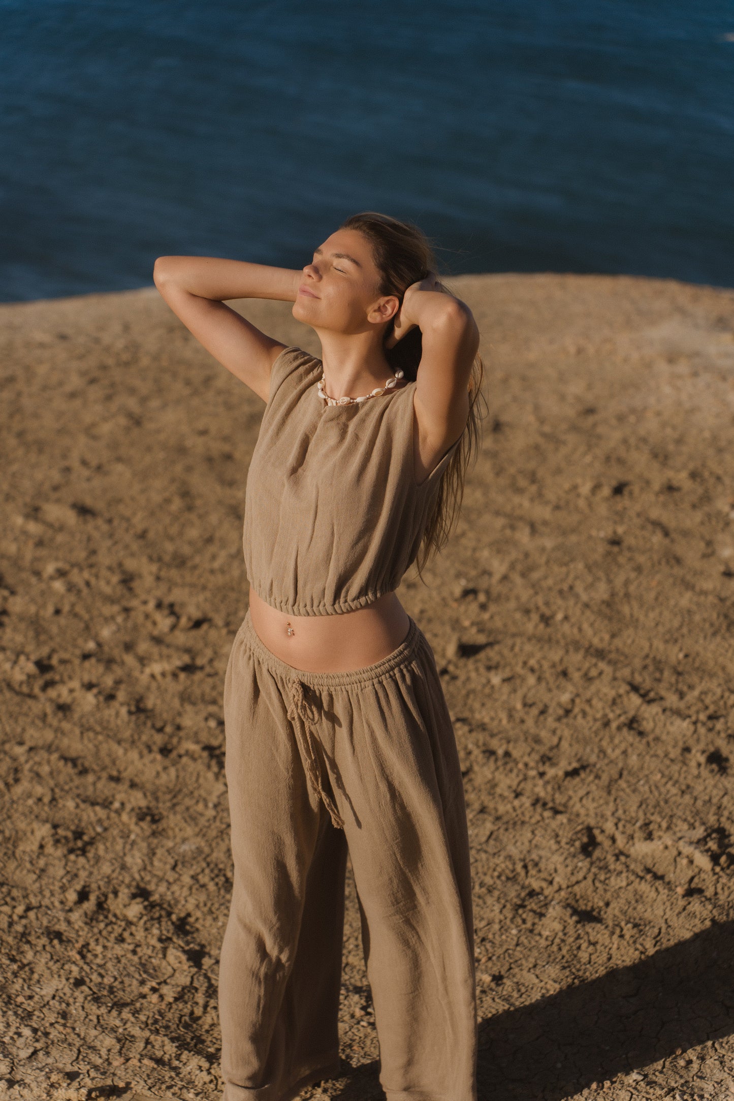 Style it with the matching Mila Pants for a relaxed, textured look that flows from beachside mornings to evening markets.